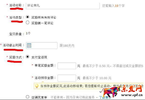 這里需要說的一點(diǎn)是,在選擇活動(dòng)類型的時(shí)候,獎(jiǎng)勵(lì)第一筆評論不難理解,那么獎(jiǎng)勵(lì)所有有效評論是什么意思呢?根據(jù)多年的經(jīng)驗(yàn),有效評論是指三十字以上的評價(jià)、緊扣寶貝屬性內(nèi)容(尺碼、顏色)寫的評論哦,是淘寶網(wǎng)系統(tǒng)自動(dòng)識別認(rèn)定的,可以是好評也可以是差評。