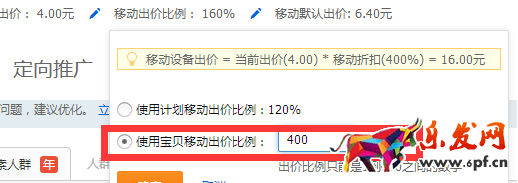 但是要注意的是這里出價是PC的4倍,一定要看看PC出價是多少再去設置。賣家們剛設置完之后,日限額就秒無,因為店鋪PC出價3元,無線折扣400等于無線出價12元,這會直接秒殺,因此要注意先把PC的出價降低,然后再提高無線折扣。這個里面就可以參考第一個知識點來設置出價。如果單純只要無線端的流量,那么就把PC的出價設置的最低,它的4倍也就是無線端詞有排名就行,不過最好是排名靠前,排名太低就要提高PC的出價。