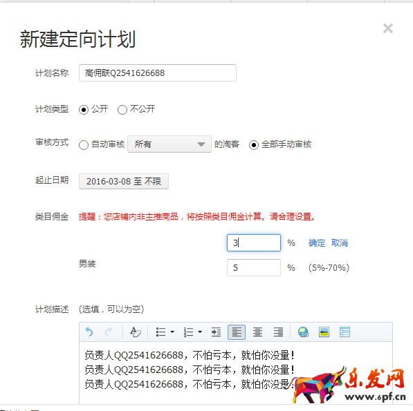 因為現在很多淘客安裝了淘客助手這個軟件。很多淘寶想推你產品的時候回很明顯的看到你的聯系方式,這樣就可以聯系你,到時候你們可以商量。那么如果覺得不是很明顯,也可以多建立幾個空白的計劃,留上聯系方式!在做淘客活動的時候,把計劃設置成公開計劃,手動審核。這樣被淘客擴散的時候,那些看到計劃的淘客,申請計劃就能看到你的聯系方式,有幾率加你的QQ。