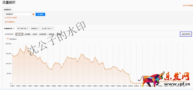 它是在直通車左邊工具里,我們進行關鍵詞分析,然后查看市場數據分析里的展現指數在右邊記得點 擊過去90天,查看展現指數的波動。那么這個動作很簡單,只有這種情況的二級詞是不要的: