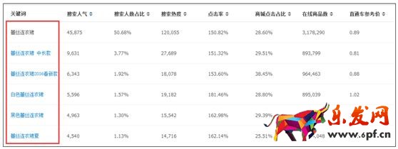 比如,你選中的是“蕾絲”,那么你就用“產(chǎn)品詞+修飾詞”的組合作為核心屬性點,在這里就是“蕾絲連衣裙”、“連衣裙 蕾絲”等。