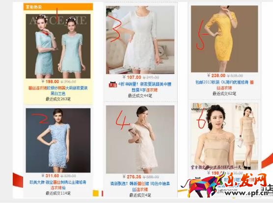 我們就以“連衣裙、蕾絲、韓版”為關鍵詞進行搜索,圖片上的幾個案例中第六個商品顯然更加符合這幾個關鍵詞的描述。他滿足了客戶的需求。