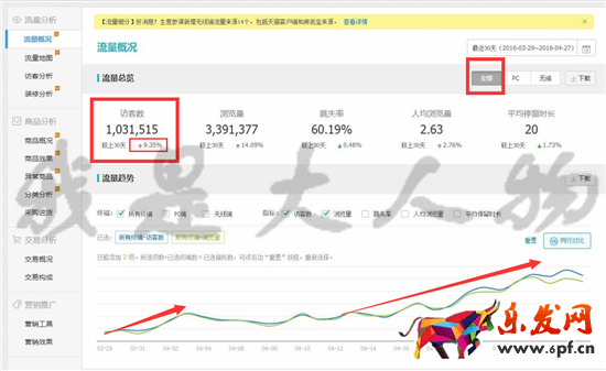2、整體訪客情況較上一周期,呈上升趨勢,同時根據不同端口,了解目前店鋪的流量主要是哪部分占比較大,以及是店鋪的核心流量:
