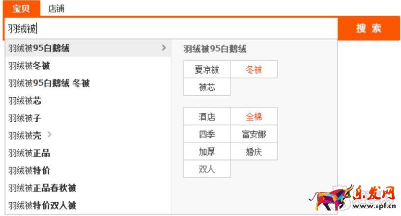 比如我們搜索羽絨被的時候,下拉框里會出現(xiàn)很多候選詞,這些都是容易被人搜索的熱門詞,流量非常大,競爭當(dāng)然也非常厲害。如果你的產(chǎn)品是比較有競爭力的,各方面權(quán)重也是比較高的,那么不論在標(biāo)題優(yōu)化還是開直通車,這種詞錯過就比較可惜了。
