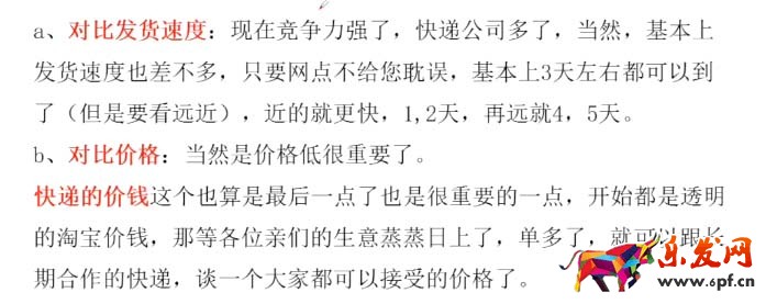 總之,在選擇快遞是要結(jié)合當?shù)刭Y源,盡量選擇知名快遞和服務(wù)、發(fā)貨質(zhì)量有保證的快遞,如果前期價格高的話訂單增高可以降價。