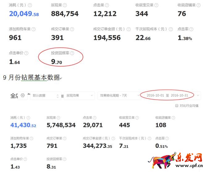 落實(shí)到最后截取了9、10月份的整體賬戶數(shù)據(jù),來看一下經(jīng)過上面的投放落地?cái)?shù)據(jù)是怎么樣的一個(gè)情況。為什么沒有截取11月份的呢,是因?yàn)?1月份中的雙十一的購(gòu)買力會(huì)有明顯的爆發(fā)對(duì)店鋪的數(shù)據(jù)支撐是有很大幫助的,不能很客觀的說明以上想法的可行性。