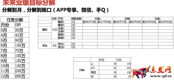 (注:本板塊是最難做的一頁ppt,因為所以的業績需要分解到單品上,分解到端口銷售數量上,如果拍腦門亂寫,運營一眼就能看出來,如果存在欺騙手段,可能就適得其反了。)