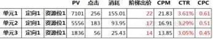 投放后,對比三個單元的投放數據,確定最適合的出價。
