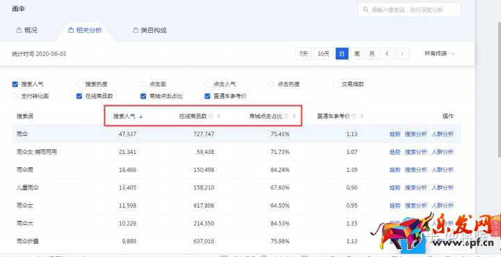 可以看出雨傘的市場競爭是非常大的,像這種可以再往后多看幾頁數(shù)據(jù),瀏覽量1000以上的,關(guān)鍵詞倍數(shù)高于0.5.商城占比低的,都是新手賣家的首選。