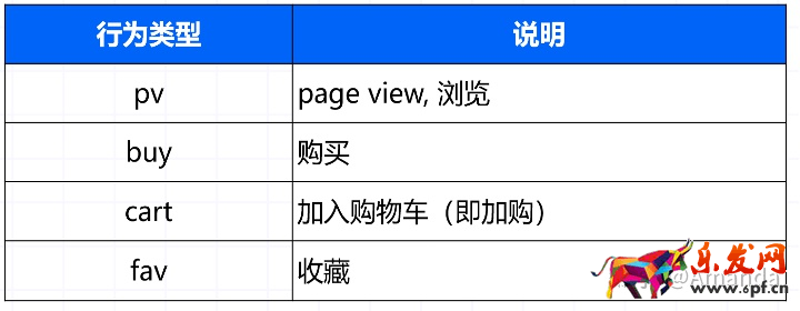 此數據集中已有的字段及behavior_type(行為類型)值域如下: