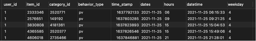 此處,為了方便后文的日期分析,這里用函數 from_unixtime(時間戳,時間格式) 和weekday()兩個時間函數將時間戳轉為不同格式的時間對表格增添,查詢如下: