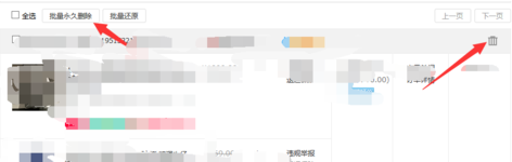 5、確認選中需要徹底刪除的訂單信息后,點擊“全選”框邊上的“批量永久刪除”。