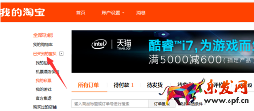 3、進入我的淘寶后,點擊全部功能下已買的寶貝。如下圖所示會顯示,你購物全部的訂單,包括未付款,已付款等等訂單。