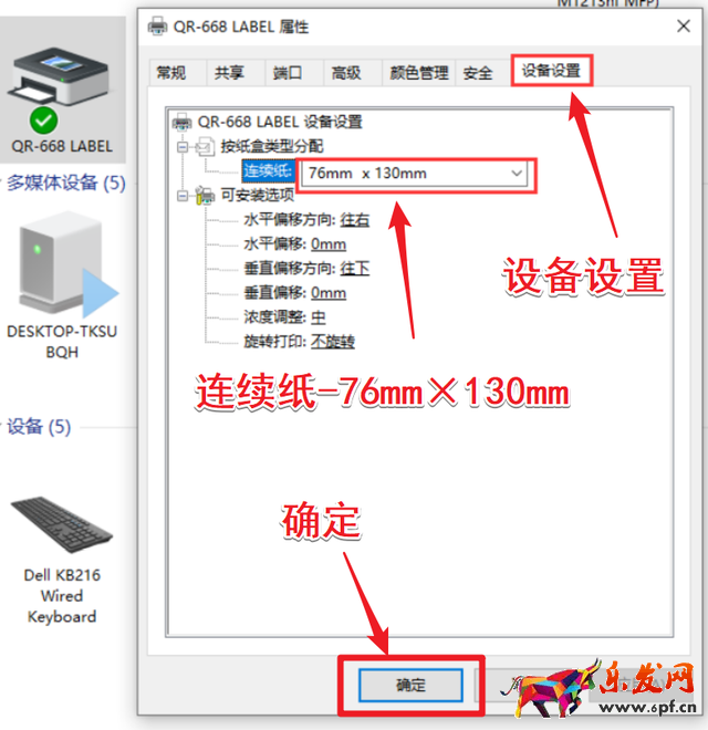 ②、設(shè)備設(shè)置-連續(xù)紙-76mm X 130mm-確定