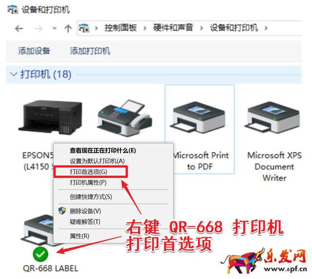 5、設(shè)置打印首選項(xiàng)①、右鍵 QR-668 打印機(jī)-打印首選項(xiàng)