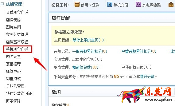 1、登錄到淘寶進(jìn)入賣(mài)家中心以后,在左邊找到手機(jī)淘寶店鋪點(diǎn)擊進(jìn)入。