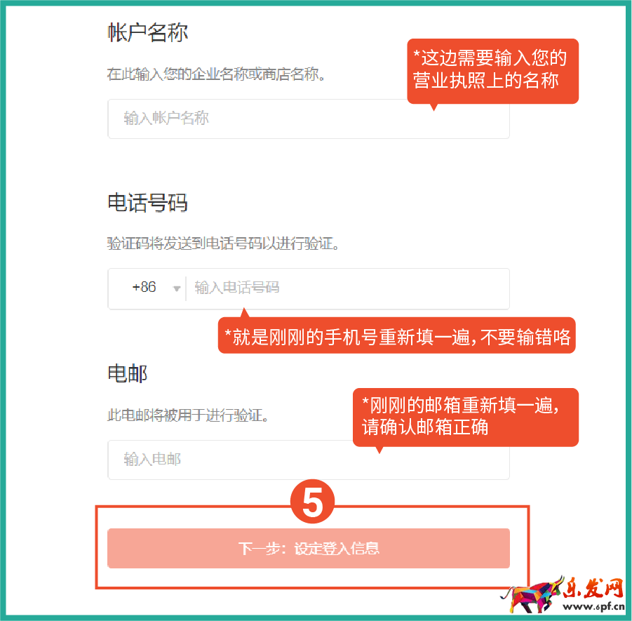 第五步,將之前的公司名、手機號和郵箱再填一遍,請注意信息前后一致。