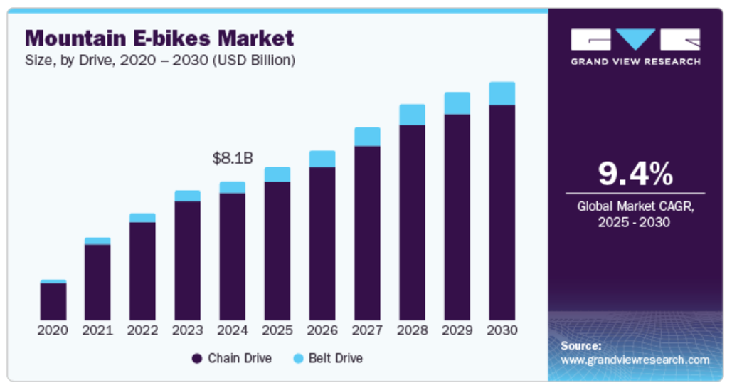 根據市場研究和咨詢公司Grand View Research的最新報告,2024年全球山地電動自行車(Mountain E-bikes)市場規模為80.8億美元,預計2025-2030年期間將以超9%的年均復合年增長率快速增長。戶外休閑和冒險運動的不斷普及,是推動山地電動自行車市場增長的主要因素。